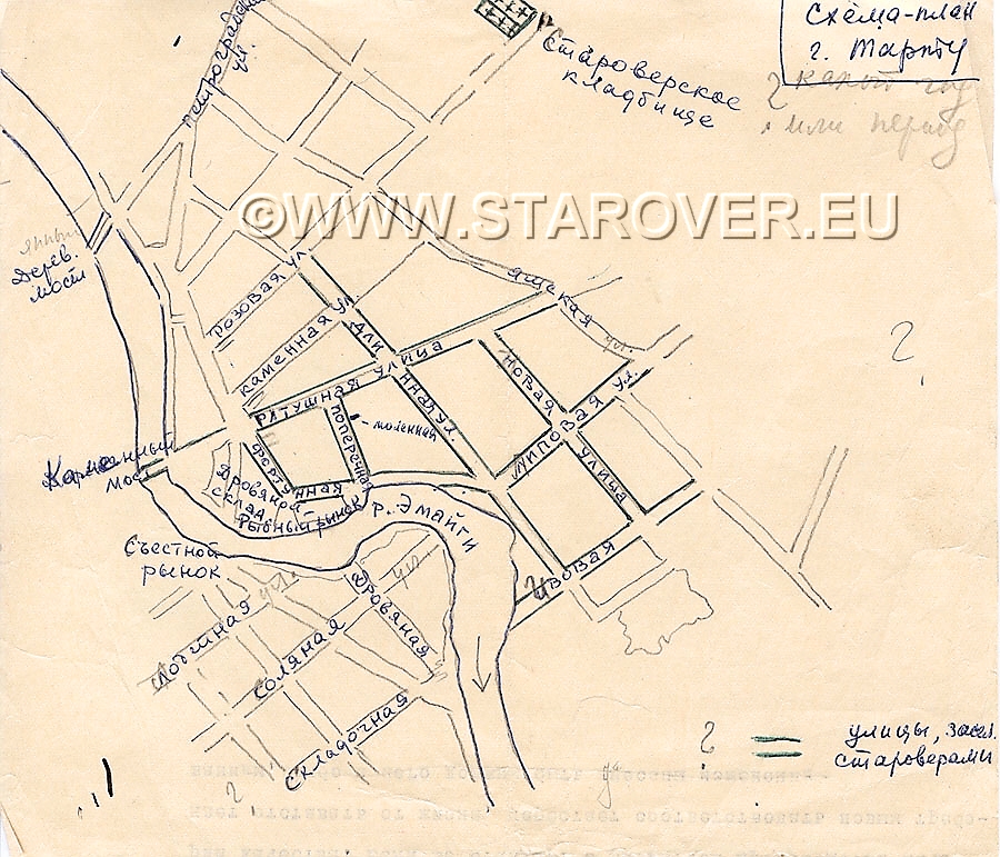 Tartu linna plaan tänavatest, kus elavad vanausulised. Koostanud: E. V. Rihter