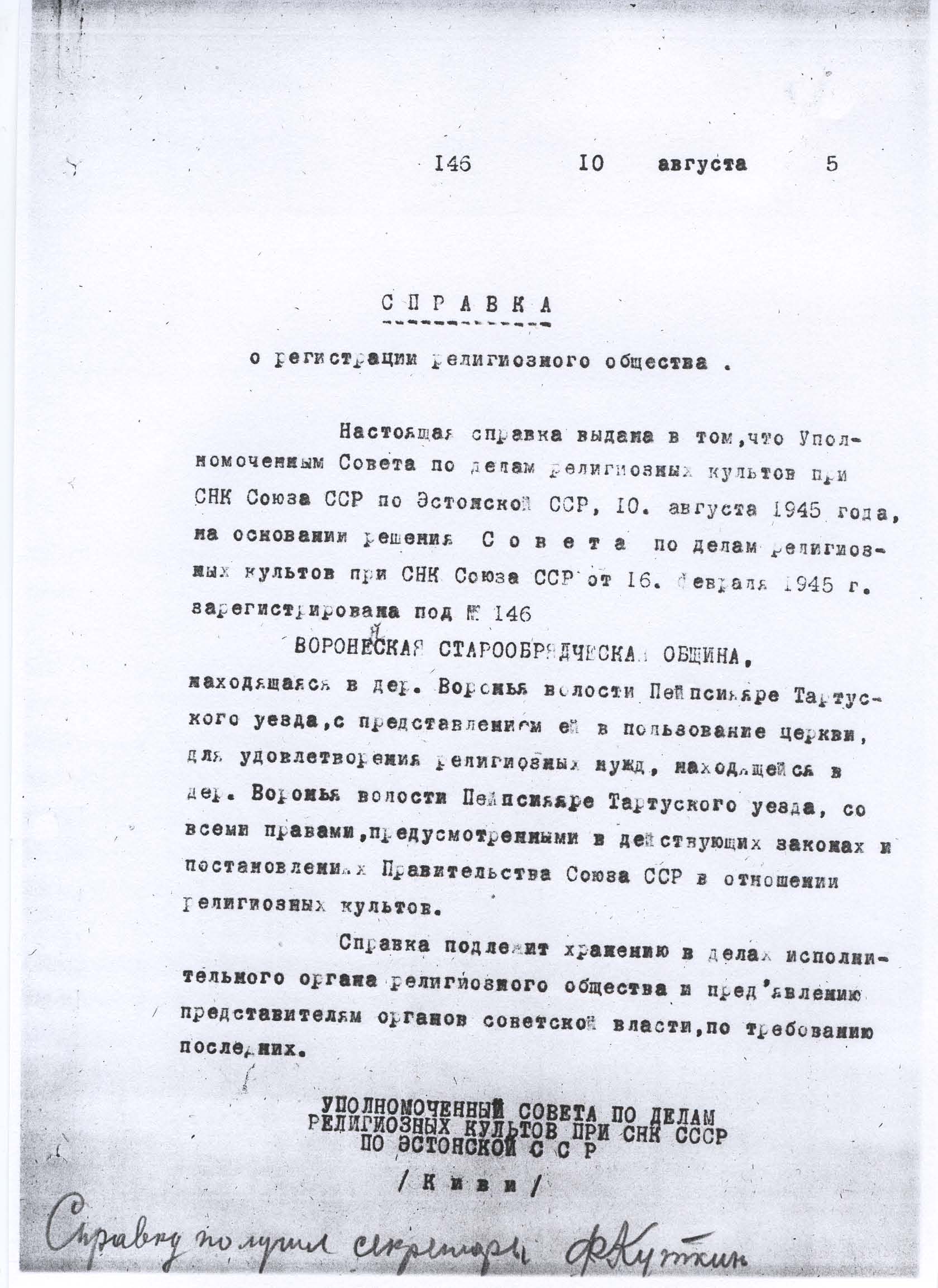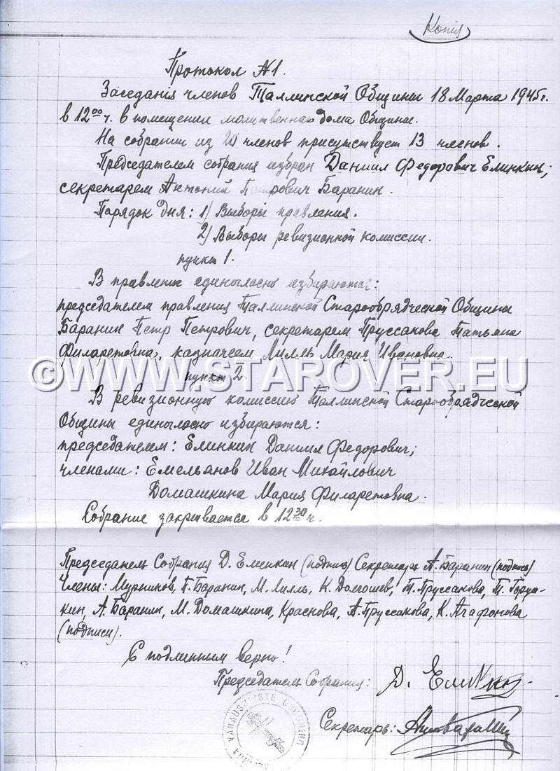 Protokoll №1 Tallinna koguduse üldkogust 1945 a.